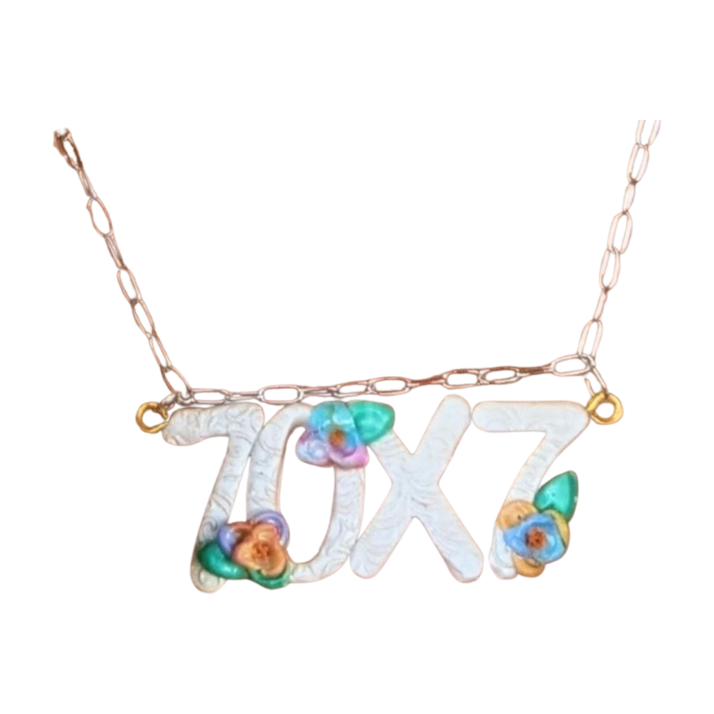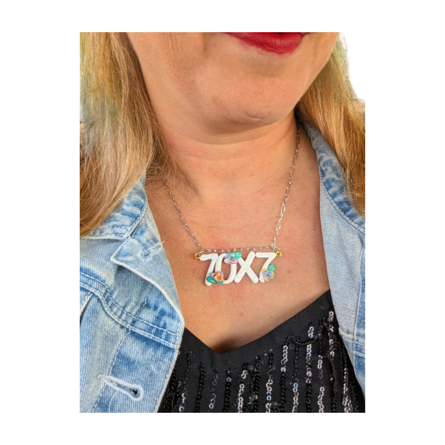 Handmade Polymer Clay pendant 1" x 2.5 " letters 70X7 with colorful flowers. Affixed on stainless steel paperclip chain. Chain is 18".